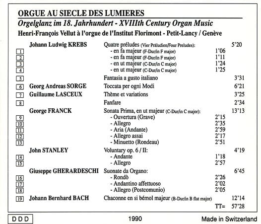 - Krebs, Sorge, Lasceux, Franck, Stanley, Gherardeschi, Bach