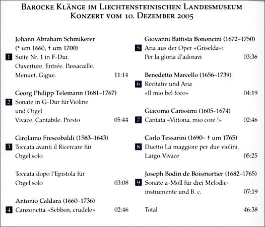 - Helga und Clarissa Frommelt (Violinen), Thomas Dünser (Cello), Josef Frommelt (Blockflöte), Maciej Zborowski (Orgel), Celia Längle (Sopran)