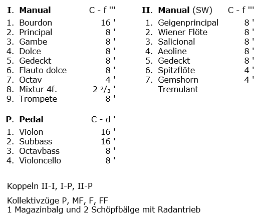 Bemerkenswert ist ferner noch eine besondere Konstruktionsart für die Becher der Trompete. Die oberen Mündungen sind sehr schön aufgeworfen und deshalb in der Länge nicht veränderbar. Zur Abstimmung der Becherlängen dient daher eine verschiebbare, cylindrisch gebaute Hülse beim untern Ende der Becher.