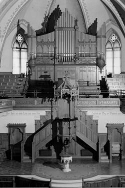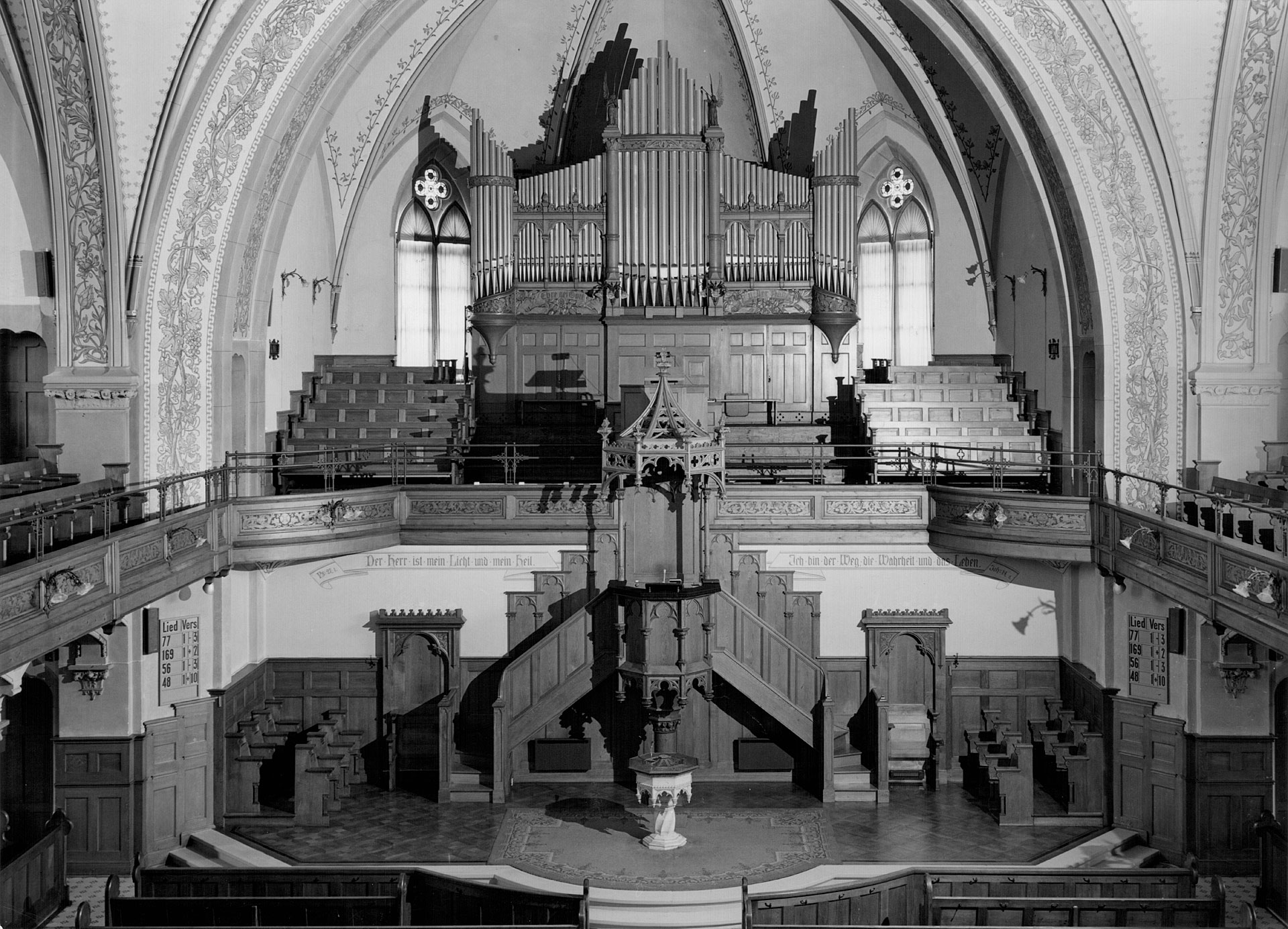 Die im Jahre 1902/05 von den Architekten Kehrer und Knell in Zürich erbaute Kirche weist die damals übliche Kreuzform mit einer Kanzelwand auf, huldigte aber in der sonstigen Formensprache nicht dem Jugendstil, sondern verharrte in der historisierenden Neugotik. Nur bei der Ausstattung, zum Beispiel in der Dekorations-malerei, schimmert der Jugendstil etwas durch. Auch der gleichzeitig entstandene Orgelprospekt enthielt etwelche Jugendstilelemente, so etwa die charakteristischen Bänder vor den Pfeifen.