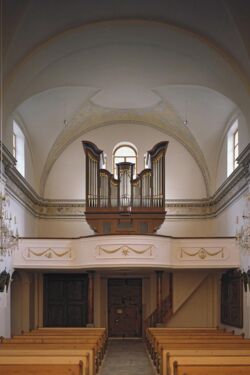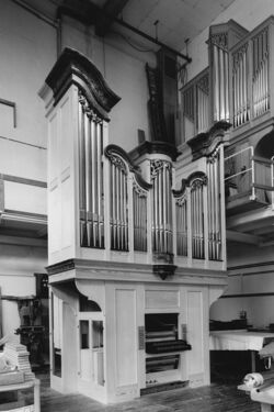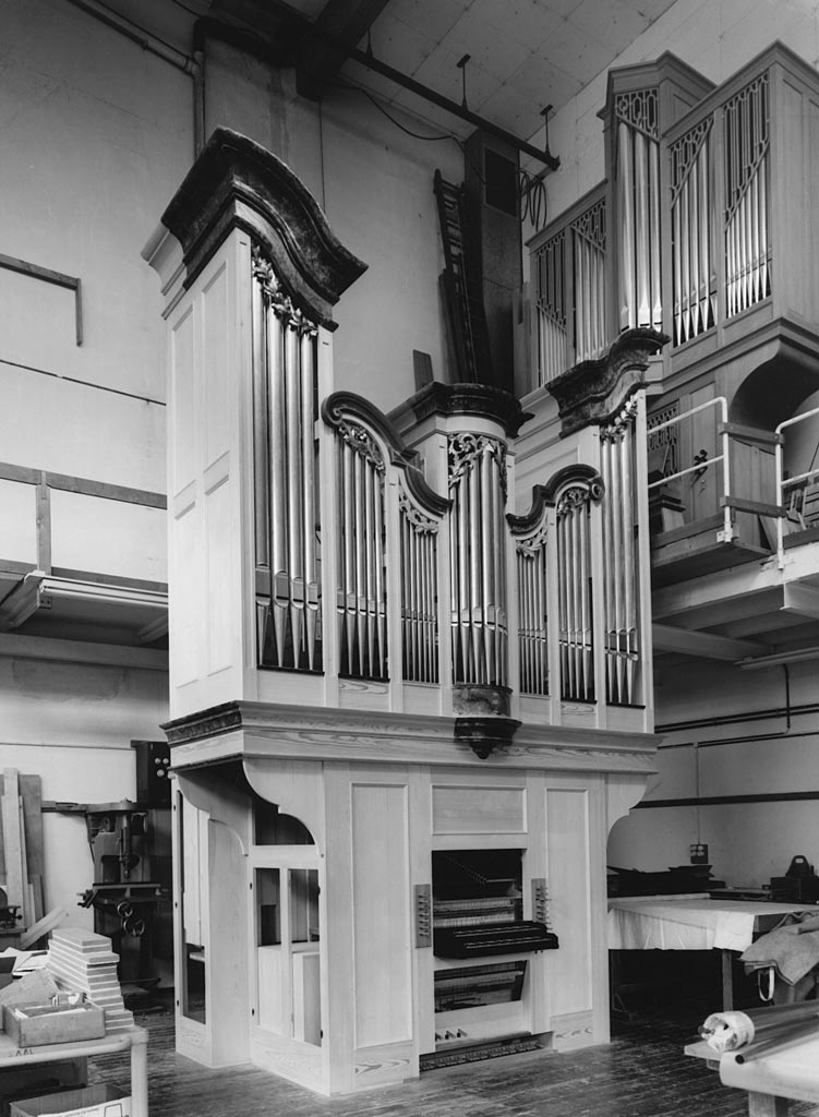 Das Schwarzweiss-Bild zeigt die Orgel in unserem Montagesaal.