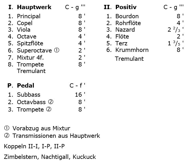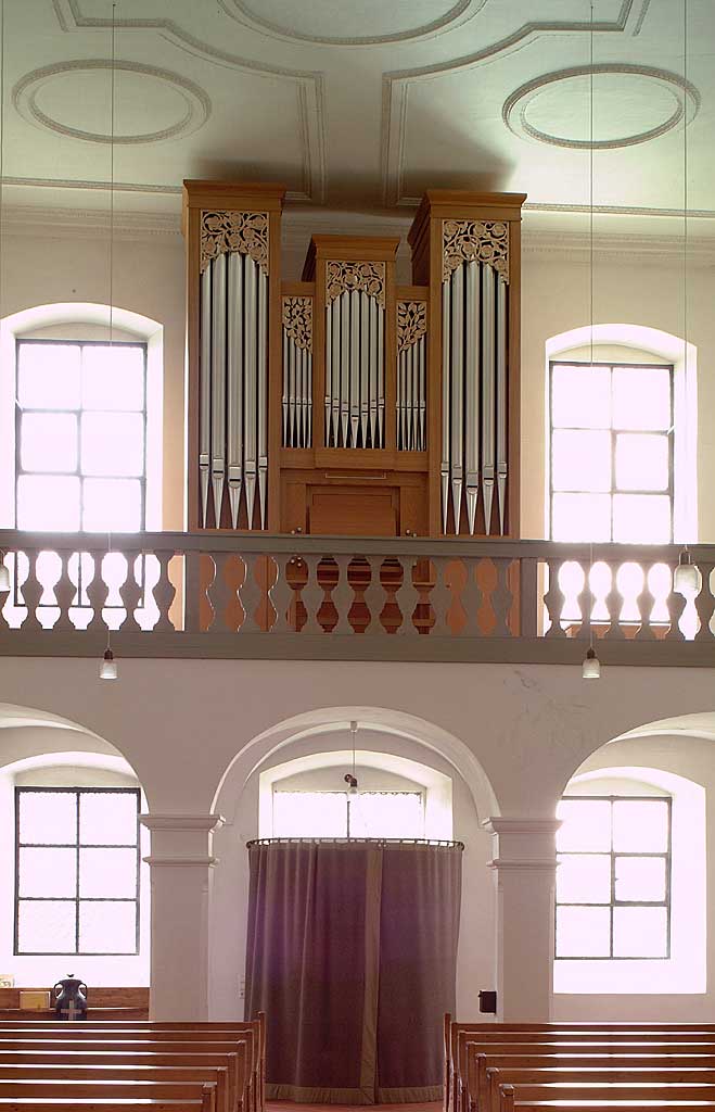 In enger Zusammenarbeit mit dem Auftraggeber haben wir für die Schlosskapelle in Bad Wurzach einen Prospekt entworfen, der sorgfältig auf die Proportionen des historischen Raumes abgestimmt ist. Eine Stilkopie in Anlehnung an die barocken Seitenaltäre wurde nicht angestrebt. Unser Ziel war die Schaffung einer zeitgemässen Orgel, welche sich am ebenfalls modern gestalteten Altarbereich der Kapelle orientiert. Die Schleierbretter aus Lindenholz wurden von der Holzbildhauerin Annelie Kremer entworfen und ausgeführt, die auch die Seitenwangen der Kirchenbänke schnitzte. Auf diese Weise ist ein interessanter Bezug zwischen neuer Orgel und Kirchenraum entstanden, der für den aufmerksamen Betrachter bis in feinste Details erkennbar wird.