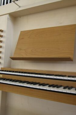 Die Abmessungen des Spieltisches entsprechen jenen einer «grossen» Orgel. Die Untertasten der beiden Manualklaviaturen sind mit griffigen Knochenbelägen bestückt, die Obertasten bestehen aus Grenadillholz. Die Pedalklaviatur hat parallele Tasten in doppelt geschweifter Anordnung.