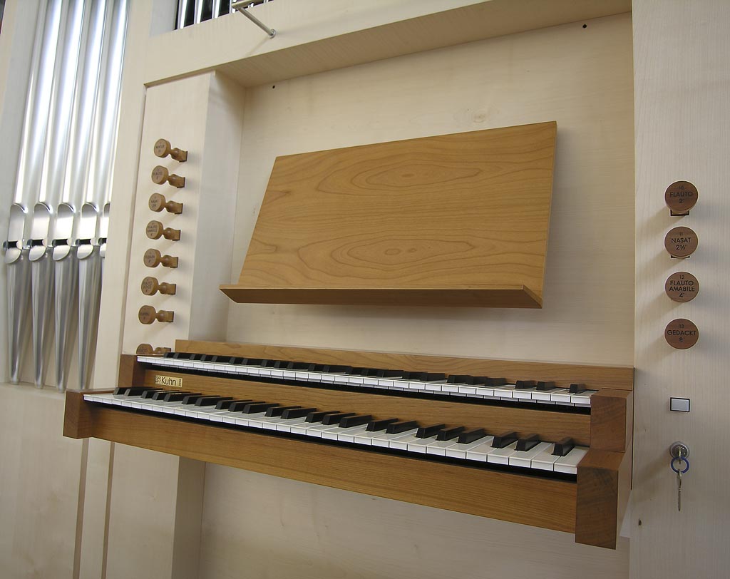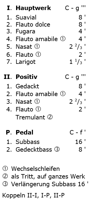 Die Grundstimmen, auf zwei Manuale verteilt, setzen sich aus einem warm klingenden Suavial 8 ', einem Gedackt 8 ' und einer Flauto dolce 8 ' zusammen, was eine nahtlose Dynamik von Forte zu Piano ermöglicht. Die Fugara 4 ' bildet die Brücke zur Klangkrone, einer milden Mixtur in 2 ' - Lage. Die Flötenregister in 4 ' -, 2 2/3 ' - und 2 ' - Lage stehen dank Wechselschleifen wahlweise dem ersten oder zweiten Manual zur Verfügung. Das Klangfundament im Pedal bildet der Subbass 16 '. Dank seiner Verlängerung um eine Oktave ist er auch als Gedackt in der Acht-fusslage spielbar.