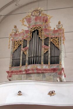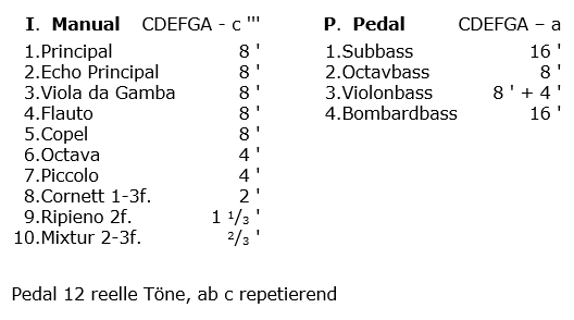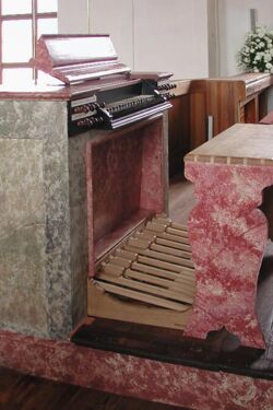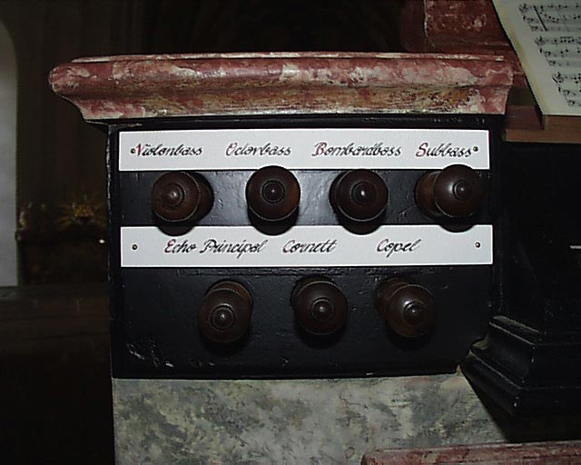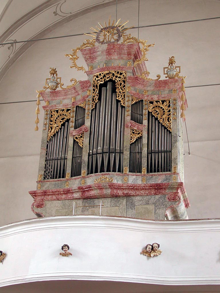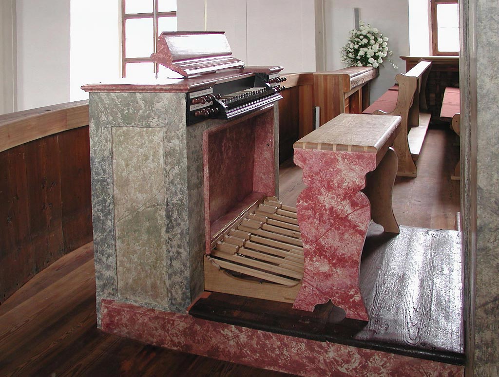 Mit vierzehn Registern auf einem Manual und Pedal ist die Orgel in Adlwang für das Volumen dieser bedeutenden Wallfahrtskirche - der ältesten in Niederösterreich - eher klein. Doch dem Orgelbauer Peter Hötzel gelang 1796 ein Meisterwerk, das grossartig klingt und die gute Akustik des Raums nutzt. Zweihundert Jahre intensiven Gebrauchs und einige unsachgemässe Eingriffe setzten der Orgel stark zu. Erstaunlich ist deshalb, dass fast das gesamte Pfeifenwerk des Manuals und die technische Anlage übernommen werden konnten. Pedalwerk und Windanlage rekonstruierten wir nach dem Vorbild von «Schwesterorgeln» in der Region. Zwei mehrfaltige Keilbälge wurden in Anlehnung an die Orgel von St. Johann am Tauern rekonstruiert und für Kalkantenbetrieb eingerichtet. Alternativ dazu wurde ein elektrisches Gebläse installiert, welches die Bälge mit Motorwind aufpumpt. Bei vollem Balg trennt eine von Kuhn entwickelte Steuerung die Verbindung zum Gebläse. Dann wird die Verbindung zur Windlade geöffnet und der Wind - genau wie bei Kalkantenbetrieb - der Orgel zugeführt.