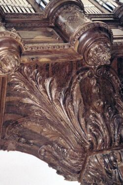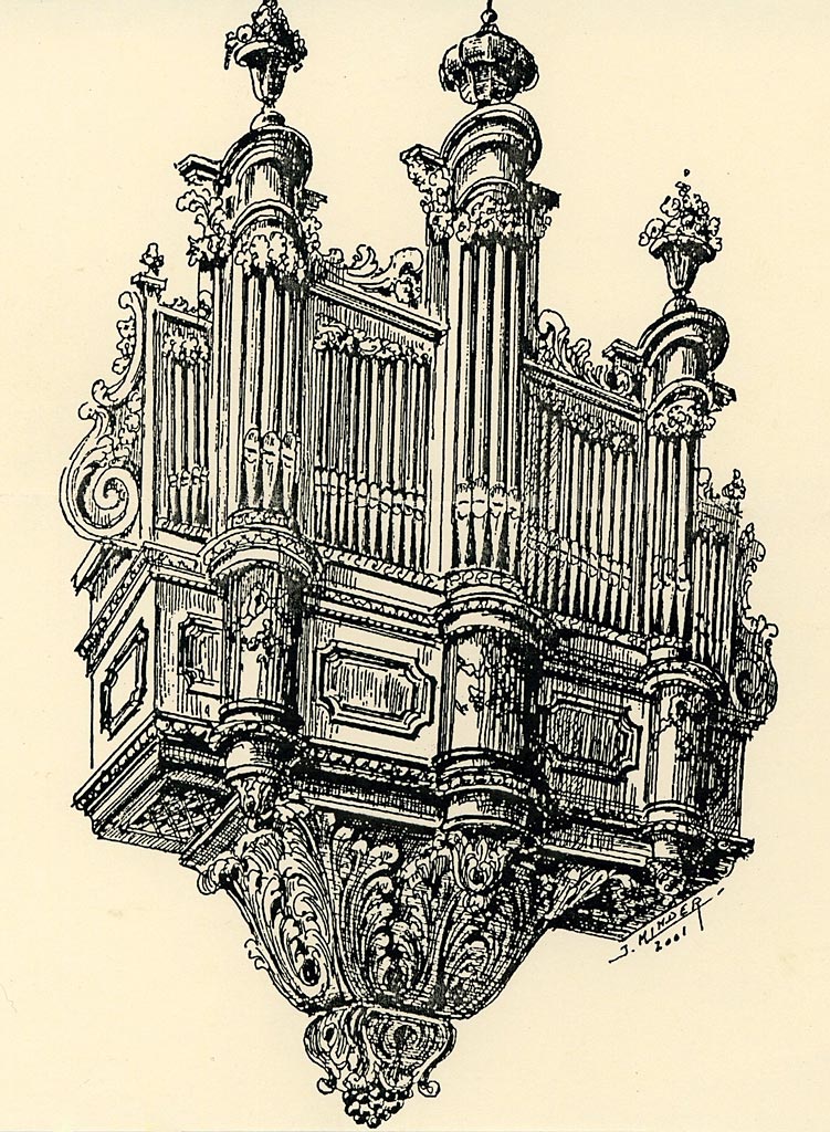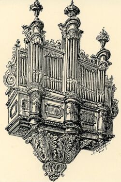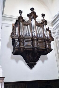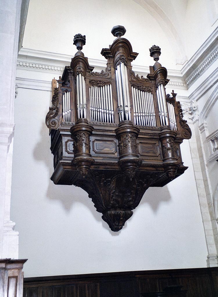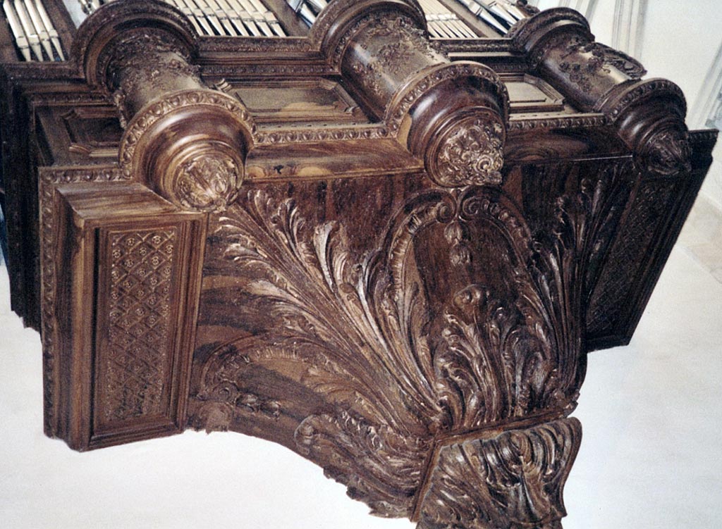 In 1890 Theodor Kuhn built a tracker organ with 18 stops still employing cone chests. To this end he used the entire old organ case of Isnard (the upper part, the pipes previously being more or less located directly on the floor) and completed it in a marvellous manner in order to house the pipework and the tracker actions of his new enlarged organ in it. He knew how to connect the old elements with his own additions: he enlarged the front by adding two side flats and moved the side wings; furthermore he lifted the organ case by means of a projection ornated with rose festoons and three corbels. The whole is supported by a console decorated with acanthus leaves. The reconstruction as a swallow's nest is consistent with the organ case and represents a coherent ensemble that is pleasing to the eye.