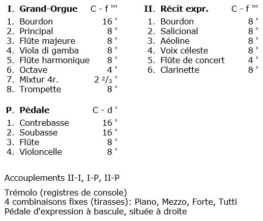 The organ mechanism and pipework of 1890 have been considerably modified by making the organ baroque and installing an electric action. The console which was located behind the organ and accessible through an adjoining building is now placed below the organ.