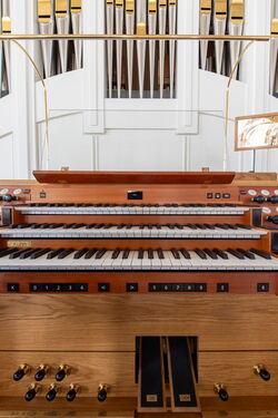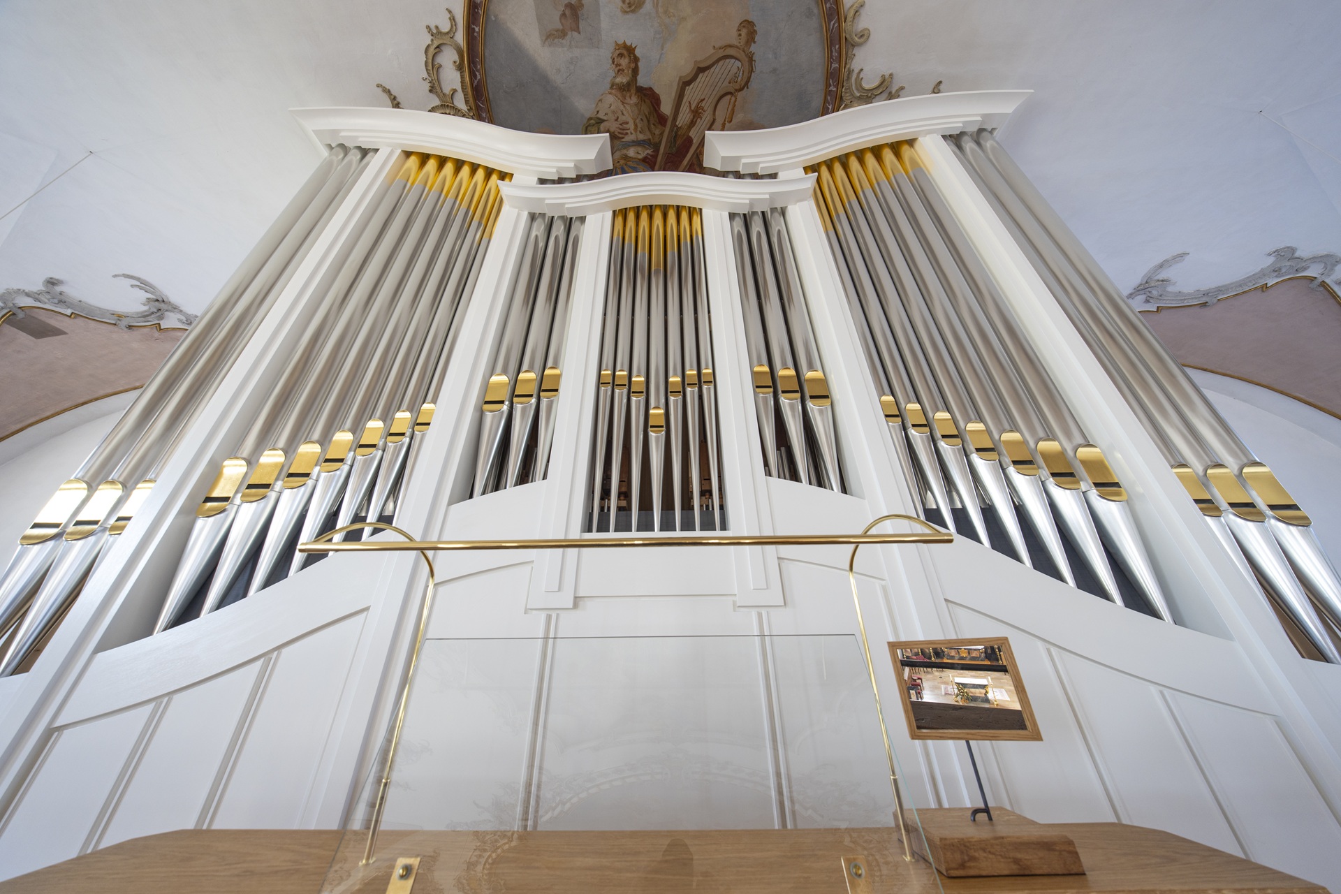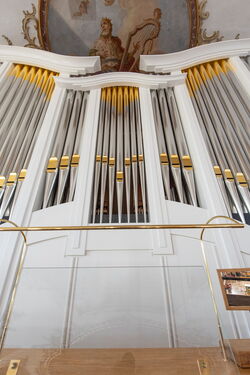 The main organ, with its gold-decorated facade pipes, was placed centrally on the upper gallery directly above the royal box. The choir organ was installed concealed in the upper sacristy. Both organs can be played via the three-manual console on the organ loft. The main organ is mechanical, the choir organ purely electric. An additional mobile central console is available for musical accompaniment in the choir room, from which the entire organ system can also be played.