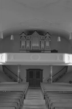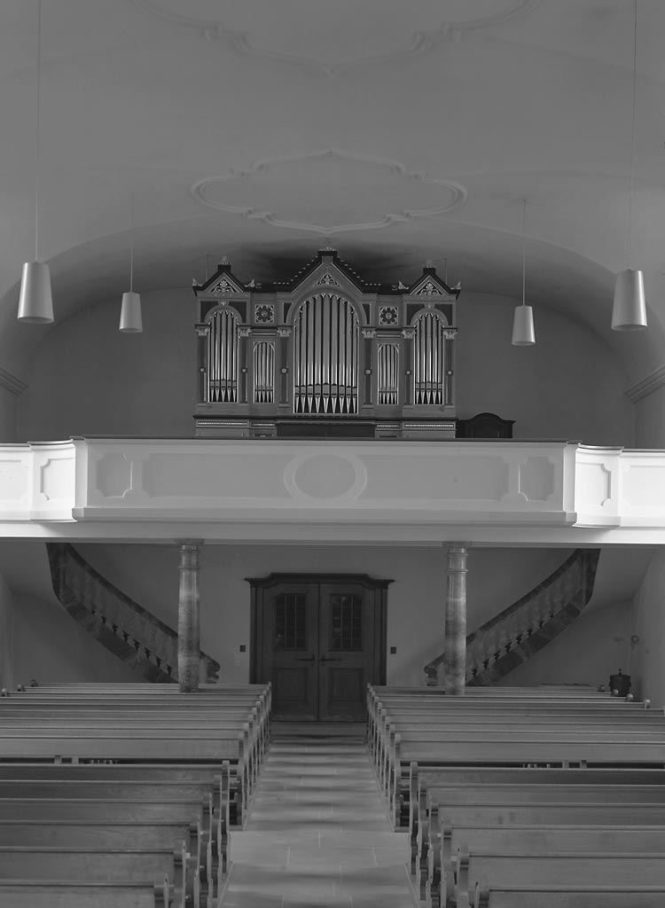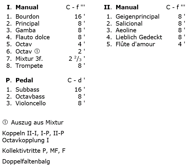 During an overall restoration of the church in 1985, the organ was also restored. The only change made to its original design was the addition of a 2 ' stop in Manual I. For this purpose the 2 ' rank from the Mixtur was rendered separately playable through the construction of an upper slider. For this purpose the bellows shank, today superfluous, was used. These modifications are reversible at any time. The overall pitch of the instrument, before 1954 at 435 Hz and then raised to 440 Hz, was retained. Since most of the pipes have a tuning slot, there is not actually much change made to the pipes themselves; the tuning roll is simply rolled up a little more. Viewed overall, this organ is a very well preserved instrument dating from 1878, and represents the era of mechanical cone-chest organs well. This type has become quite rare as most of these cone-chest organs were later made pneumatic and then later replaced by new instruments.
