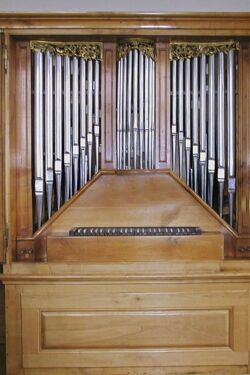 La soufflerie actuelle a été conservée; l'utilisateur tenait à conserver les avantages d'une alimentation avec moteur. Toutefois, une reconstitution d'une soufflerie ancienne pourrait sans problème s'envisager à l'avenir.