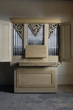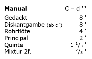 Avec ses six jeux ce positif convient pour le continuo et encore pour une littérature allant jusqu'aux concertos de Händel. Le tirage des jeux se fait par tirasses. Livré sans banc d'orgue, la hauteur de son clavier est prévue pour l'utilisation d'une chaise normale.